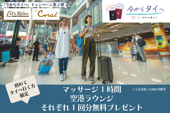| 特典内容 | 1人合計約12,000円相当の特典 (1)Let’s Relaxスパで1時間のタイ古式マッサージ -Let’s Relaxスパバンコク都内の店舗で使用可能 (2)空港ラウンジ1回分の利用 -バンコク スワンナプーム国際空港またはドンムアン空港のコーラルラウンジで最長3時間の利用 |