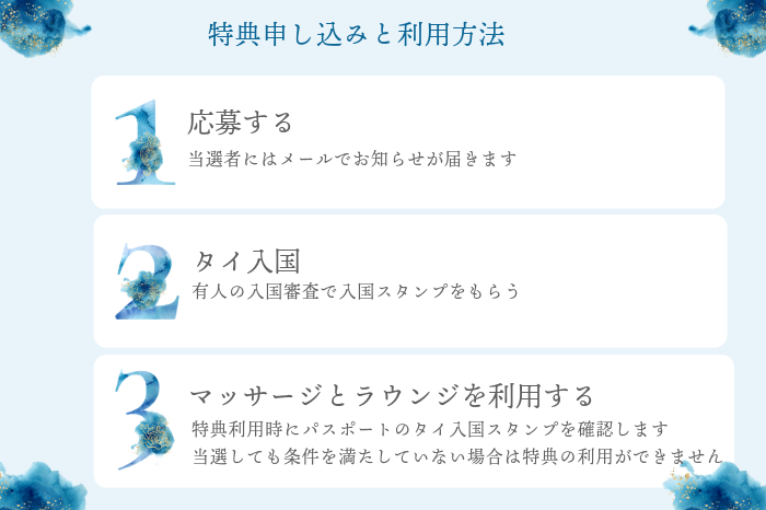 対象となる方は、タイ入国が2024年10月1日から2024年12月29日の方です。対象者は応募フォームから応募し、当選通知を受け取った方がタイで特典を利用できます。当選者はタイに入国する際、有人カウンターで入国スタンプをもらってください。このスタンプが特典利用の条件となり、スタンプの日付が2024年10月1日から2024年12月29日である必要があります。特典利用時はパスポートの入国スタンプを見せてください。Let’s Relaxスパでマッサージ1時間および空港ラウンジが1回ずつ無料でご利用いただけます。