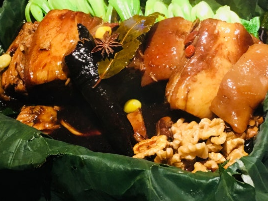 香辛料と皮付きサムギョプサルを8時間以上煮込んで蒸した蘇州本土の味をそのまま盛り込んだ蓮の葉トンポーロー!