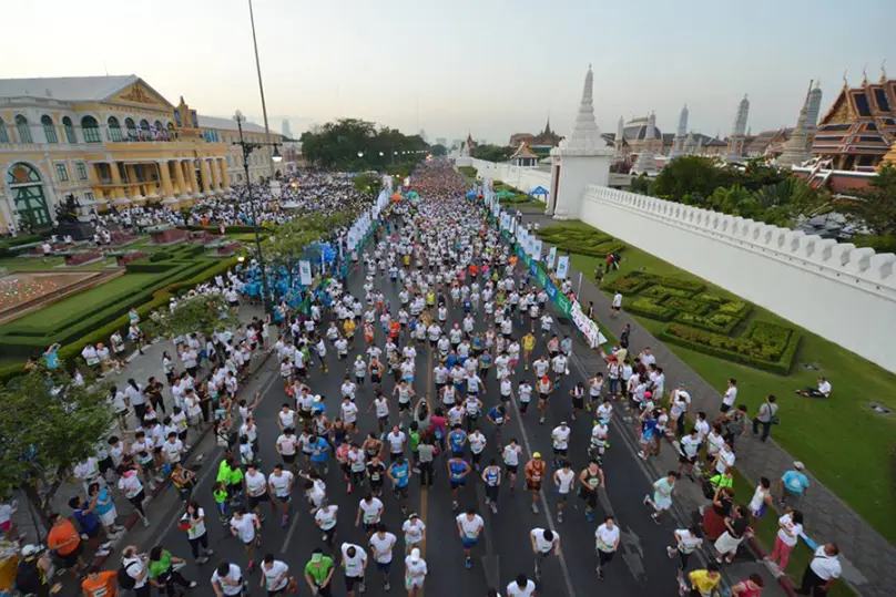 王宮前がスタート地点。フルマラソン、車椅子、ハーフ、ファンラン部門があり、初心者でも楽しめるタイ最大のマラソン大会です。健康ブームを背景に、地元のランナーはもちろん、日本人を含めて世界各国から毎年約4万人が参加しています。公式ウエブサイト(英語)での申し込みも可能。マラソン初心者も大歓迎です!