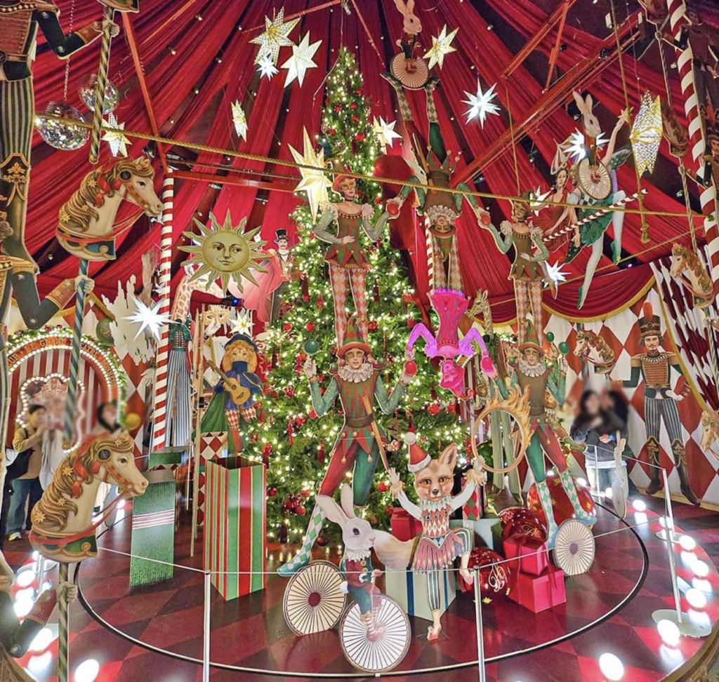 今回のコンセプトは、くまのハリーと少女が動く大劇場"を探して熱気球に乗って旅立つ世界観ですが、サーカス場のように飾られた大劇場の中では、踊る人形や空中に浮かぶ熱気球、クリスマスの飾りがとてもきれいです。フォトゾーンも多いですよ!! 一度は必ず行ってみる価値があるような気がする!!